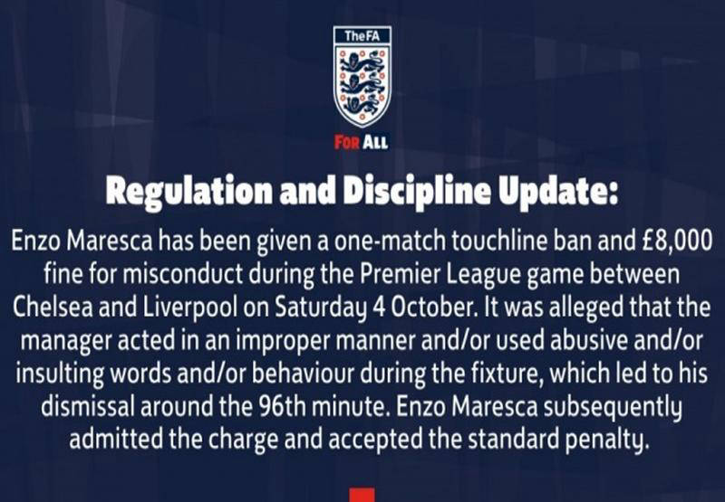 英格兰足球总会发布公告称,在对阵利物浦的比赛中,马雷斯卡因言语不当并使用侮辱性语言,在第96分钟被主裁判罚下红牌。因此,马雷斯卡将被禁赛一场,并需缴纳8000英镑罚款。马雷斯卡已承认指控并表示愿意接受相应处罚。